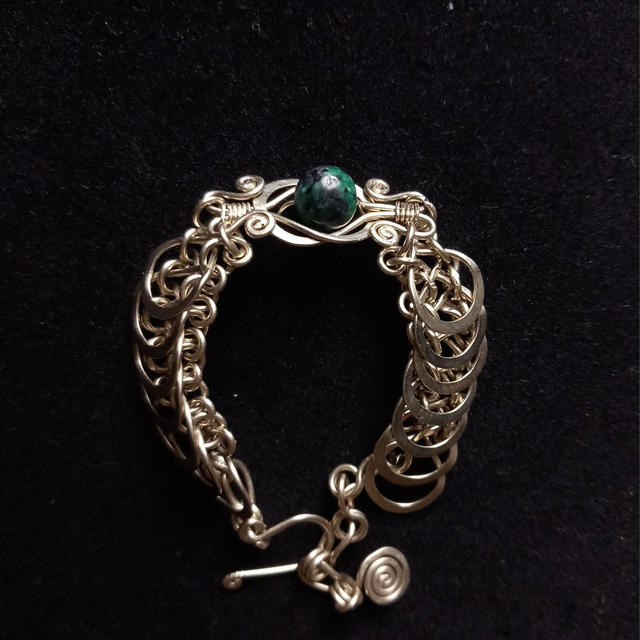 – Pierres : Jaspe dalmatien ou zoïsite avec trace de rubis